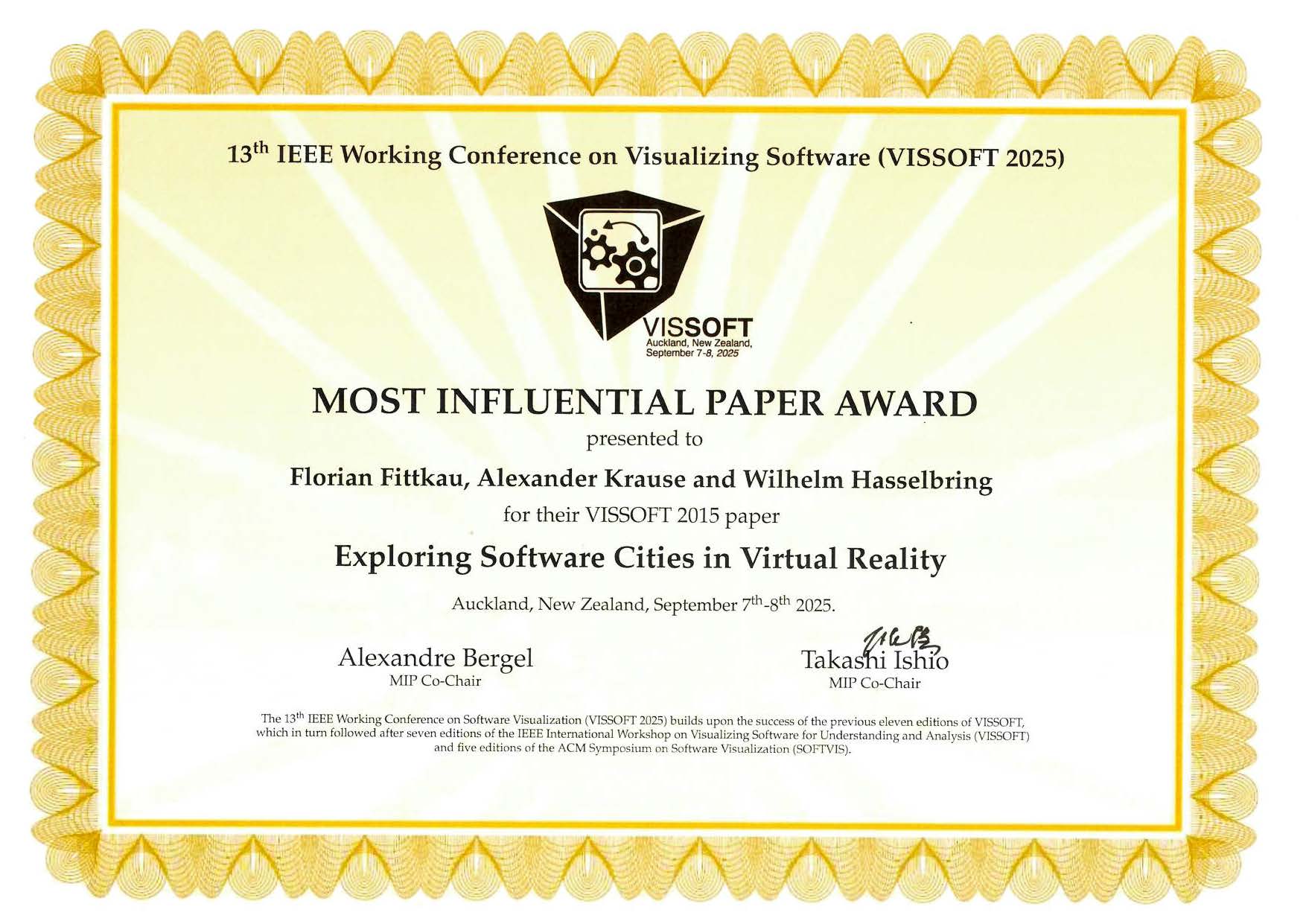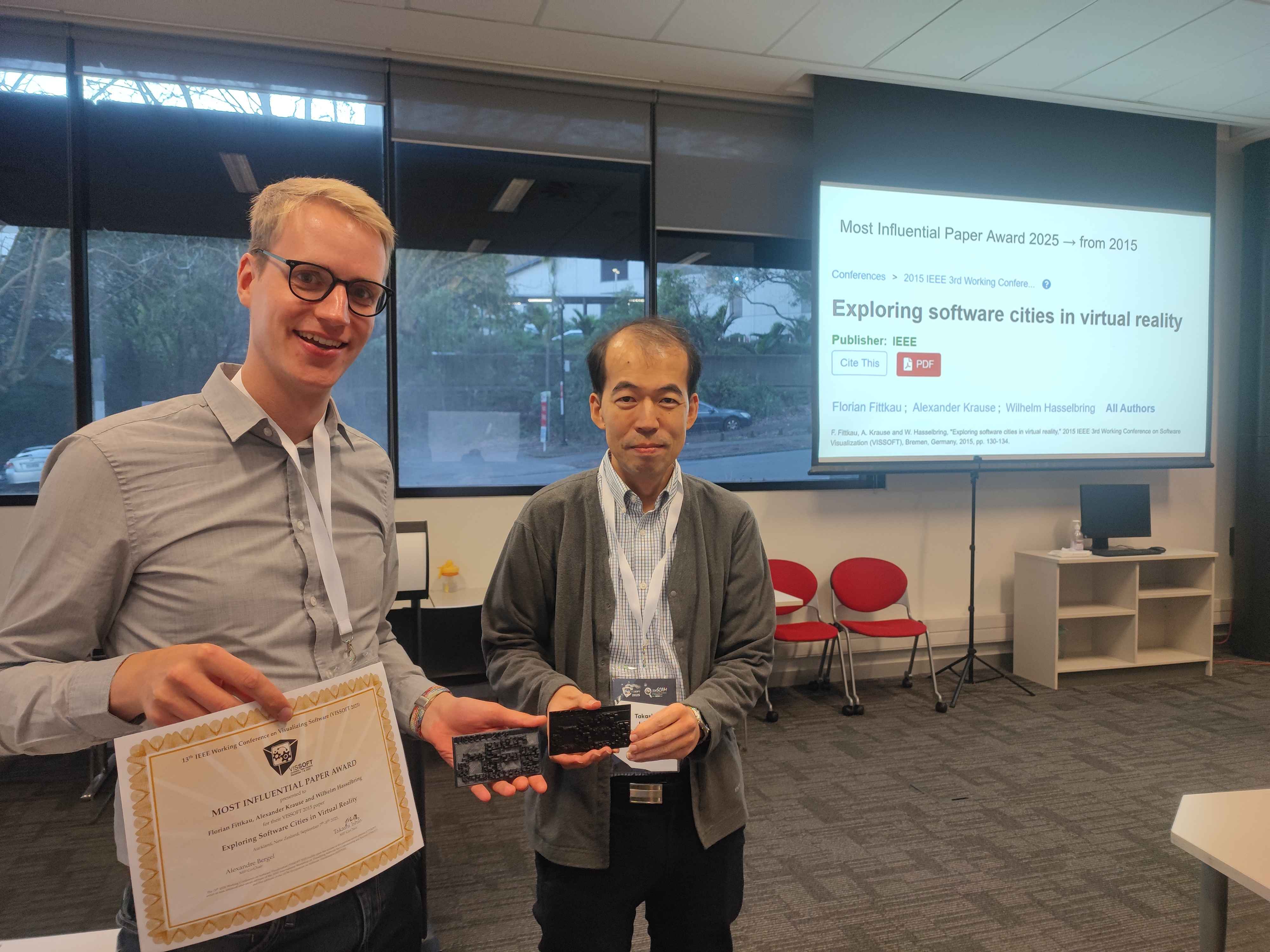 | Sep 2025 | Most-Influential Paper Award at VISSOFT 2025 Most-Influential Paper Award at VISSOFT 2025We are honored that our paper entitled “Exploring Software Cities in Virtual Reality” has been selected as the most-influential paper of VISSOFT 2015. The MIP talk slides (presented by Malte Hansen at the Thirteenth IEEE Working Conference on Software Visualization (VISSOFT 2025)) are available at https://doi.org/10.5281/zenodo.17201113